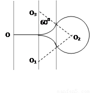 £¨2£©ÓÉÓÚÔÚÁ½´Å³¡ÇøÓòÖÐÁ£×ÓÔ˶¯°ë¾¶Ïàͬ£¬ÈçͼËùʾ£¬Èý¶ÎÔ²»¡µÄÔ²ÐÄ×é³ÉµÄÈý½ÇÐΦ¤O1O2O3ÊǵȱßÈý½ÇÐΣ¬Æä±ß³¤Îª2R¡£ËùÒÔÖмä´Å³¡ÇøÓòµÄ¿í¶ÈΪ