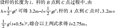 AB自然下垂地悬挂在天花板上,放开后直杆让其做自由落体运动,已知直杆通过A点下方3.2 m处一点C历时0.5 s,求直杆的长度是多少.(不计空气阻力,g=10 m/s2)答案: