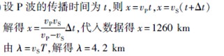 地震时,震源会同时产生两种波,一种是传播速度约为3. 5 km/ s 的S 波,另一种是传播速度约为7. 0 km/ s 的P 波. 一次地震发生时,某地震监测点记录到首次到达的P波比首次到达的S 波早3 min. 假定地震波沿直线传播,震源的振动周期为1. 2 s, 求震源与监测点之间的距离x 和S 波的波长