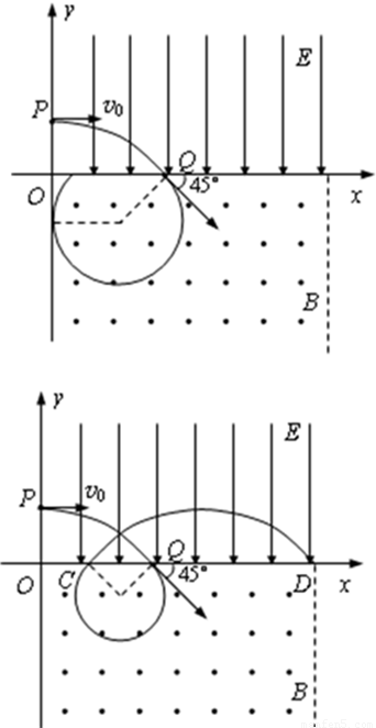 【答案】分析:(1)粒子在第一象限内做类平抛运动,在x轴方向上做匀速直线运动,在y轴方向做初速度为零的匀加速直线运动,已经知道在Q点时的速度方向为45°,可知此时沿两个坐标轴的速度都是v,在x轴和y轴分别列式,可求出OP的距离.