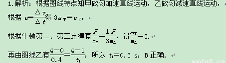 两物体甲和乙在同一直线上运动,它们在0~0.4 s时间内的v-t图象如图所示.若仅在两物体之间存在相互作用,则物体甲与乙的质量之比和图中时间t1分别为 ( )