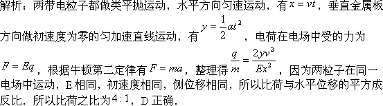 一平行板电容器中存在匀强电场,电场沿竖直方向.两个比荷(即 粒子的电荷量与质量之比)不同的带正电的粒子a和b,从电容器边缘的P点(如图)以相同的水平速度射入两平行板之间.测得a和b与电容器极板的撞击点到入射点之间的水平距离之比为1:2.若不计重力,则a和b的比荷之比是
