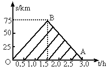 由于匀速直线运动在 s-t图象中是一条直线,可作出各辆车从A站出发到B站又回到A站的位移图象.从图上可知,BA与各线有五个相交点,即在返回途中第一辆车遇到5辆车,相遇点分别距点A62.5km、50km、37.5km、25km、12.5km,相遇时间分别是1.75h、2.0h、2.25h、2.5h、2.75h. |