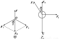 【答案】分析:当用力拉绳子的中点时,绳子对两球有作用力,使它们要发生滑动.则对球受力分析由力的合成,得出两段绳间的夹角为α时绳子力大小,从而再对O点进行受力分析,再由力的合成去寻找力的三角函数关系.
