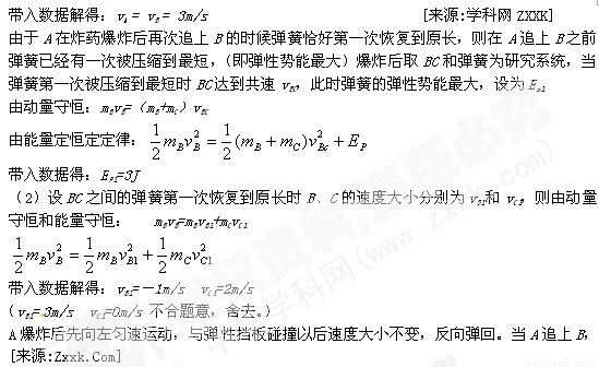 ÈçͼËùʾ£¬ÔÚ×ã¹»³¤µÄ¹â»¬Ë®Æ½¹ìµÀÉϾ²Ö¹Èý¸öСľ¿éA¡¢B¡¢C£¬ÖÊÁ¿·Ö±ðΪmA=1kg£¬mB=1kg£¬mC=2kg£¬ÆäÖÐBÓëCÓÃÒ»¸öÇᵯ»É¹Ì¶¨Á¬½Ó£¬¿ªÊ¼Ê±Õû¸ö×°Öô¦ÓÚ¾²Ö¹×´Ì¬£»AºÍBÖ®¼äÓÐÉÙÐíËܽºÕ¨Ò©£¬AµÄ×ó±ßÓÐÒ»¸öµ¯ÐÔµ²°å£¨Ð¡Ä¾¿éºÍµ¯ÐÔµ²°åÅöײ¹ý³ÌûÓÐÄÜÁ¿Ëðʧ£©¡£ÏÖÔÚÒý±¬ËܽºÕ¨Ò©£¬ÈôÕ¨Ò©±¬Õ¨²úÉúµÄÄÜÁ¿ÓÐE=9Jת»¯ÎªAºÍBÑØ¹ìµÀ·½ÏòµÄ¶¯ÄÜ£¬AºÍB·Ö¿ªºó£¬AÇ¡ºÃÔÚBCÖ®¼äµÄµ¯»ÉµÚÒ»´Î»Ö¸´µ½Ô³¤Ê±×·ÉÏB£¬²¢ÇÒÔÚÅöײºóºÍBÕ³µ½Ò»Æð¡£Çó£º