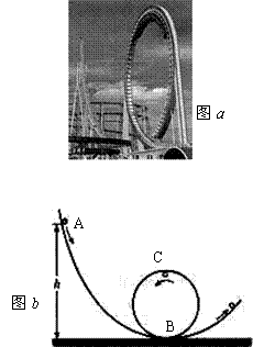 游乐场的过山车可以底朝上在圆轨道上运行,游客却不会掉下来,如下图a。我们把这种情况抽象为如图b的模型:弧形轨道的下端与竖直圆轨道相接,使质量为m=0.1kg小球从A点沿弧形轨道上端滚下,小球进入圆轨道下端B点后沿圆轨道运动至最高点C点。已知h=72cm,BC两点间距离为40cm,