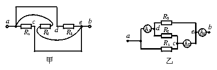 当电路中串并联关系不清晰时,要进行电路简化,简化的依据:①一段导线两端,应视为等势点;②一个电阻或灯泡上无电流通过,则电阻或灯泡两端等电势;③理想电压表及电容器连接的两点视为断路,理想电流表连接的两点视为短路. 解析:对原电路“简化”前先用短路线代替电流表,此时看到d与a等电势,c与e等电势.由此把原电路图演变为甲图;再把甲图中R2方位转过180°,可看出R1、R2和R3为并联关系.根据原电路图把