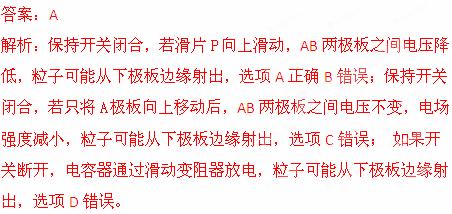 A. 保持开关闭合,若滑片P向上滑动,粒子可能从下极板边缘射出