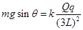 如图所示,在倾角为θ的光滑绝缘斜面底端O点固定一带电量为-Q的点电荷,一质量为m的带电小滑块(可视为点电荷)从距斜面底端4L的A点无初速度释放,下滑到B点时,速度达最大值v,已知O、B两点间的距离为3L,重力加速度为g,静电力常量为k。
