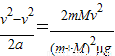 D¡¢¸ù¾Ý¶¯Á¿¶¨ÀíµÃ£¬-ft=Mv-Mv£¬f=¦Ìmg£¬½âµÃ£ºt=
