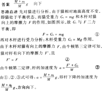 一只小猫跳起来抓住悬挂在天花板上的竖直木杆,如图所示,在这一瞬间悬绳断了,设木杆足够长,由于小猫继续上爬,所以小猫离地面高度不变,则木杆下降的加速度大小为________,方向为________.(设小猫质量为m,木杆的质量为M)