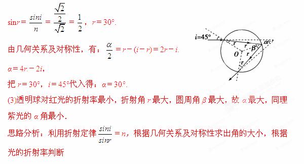 (3)如果入射的是一束白光,透明球的色散情况与玻璃相仿,问哪