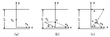 可以看出:在L、vc一定时,t随sinθ增大而减小.当θ= ②如图(b)所示,渡河的最小位移即河的宽度.为了使渡河位移等于L,必须使船的合速度v的方向与河岸垂直,即沿河岸方向的速度vx=0,这时船头应指向河的上游,并与河岸成一定的角度θ,根据三角函数关系有:vs-vccosθ=0,θ=cos 因为0≤cosθ≤1,所以只有在vs<vc时,船才有可能垂直河岸横渡. ③如果水流速度大于船在静水中的航行速度,则不论船的航向如何,总要被水冲向下游,怎样才能使漂下的距离最短呢?如图(c)所示,设船头(vc)与河岸成θ角,合速度(v)与河岸成α角,可以看出:α角越大,船漂下的距离x越短.那么,在什么条件下α角最大呢?以vs的矢尖为圆心,vc为半径画圆,当v与圆相切时,α角最大.根据cosθ=vc/vs,船头与河岸的夹角应为θ=cos 船漂下的最短距离为 xmin=vxt=(vs-vccosθ) 【评析】船渡河问题可用合成方法解决,也可以用运动的分解方法解决,解题中应灵活掌握. |