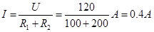 如图所示的电路中,U ="120" V,R1 =100Ω,R2 =200Ω,则a、b两端的电压为![]()