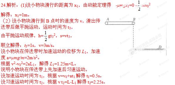 (2)若传送带正以恒定速度向右传送,小物块从A点滑上传送带经时间t后落在D点,CD长S=3m。求时间t。