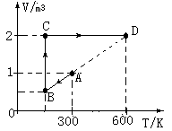 =300K,则气体在状态D的温度是________.将上述状态变化过程在V-T图中表示出来(图中要标明A、B、C、D四点,并且要画箭头表示变化的方向).