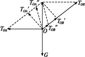该题是动态平衡问题,取结点O为研究对象,绳OA、OB的拉力的合力F与灯的重力G大小相等、方向相反,始终不变.由平行四边形定则画出矢量图如图所示.由图可知,在A点上移的过程中,TOA先变小后增大,TOB一直减小,故选BD.