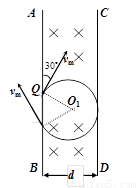 (20分)如图所示,在空间中存在垂直纸面向里的场强为B匀强磁场,其边界AB、CD的宽度为d,在左边界的Q点处有一质量为m,带电量为负q的粒子沿与左边界成30o的方向射入磁场,粒子重力不计.求: