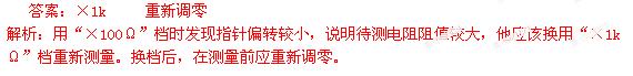 00Ω”档时发现指针偏转情况如图所示,则他应该换用______档(填“×10Ω”档或“×1kΩ”)重新测量。换档后,在测量前应_______________