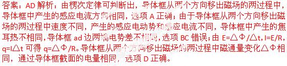 如图所示,垂直纸面的正方形匀强磁场区域内,有一位于纸面的、电阻均匀的正方形导体框abcd,现将导体框分别朝两个方向以v、3v速度匀速拉出磁场,则导体框从两个方向移出磁场的两过程中
