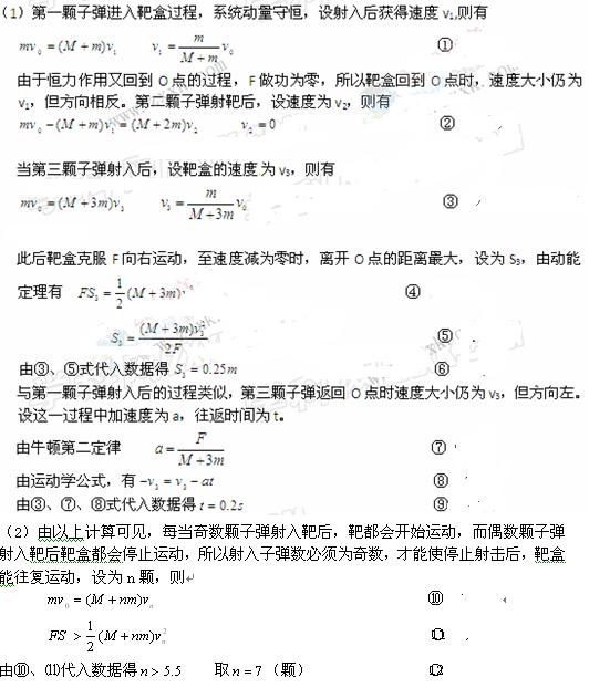 如图所示,质量为M=0.7kg的靶盒位于光滑水平导轨上。在O点时,恰能静止,每当它离开O点时便受到一个指向O点的大小恒为F=50N的力。P处有一固定的发射器,它可根据需要瞄准靶盒。每次发射出一颗水平速度v0=50m/s,质量m=0.10kg的球形子弹(它在空中运动过程中不受任何力的作用)。当子弹打入靶盒后,便留在盒内不反弹也不穿出。开始时靶盒静止在O点。今约定,每当靶盒停在或到达O点时,都有一颗子弹进入靶盒内。