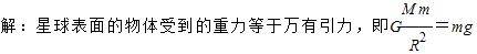 点评:本题主要考查星球表面的重力等于万有引力这个关系,这个关系在天体问题中有重要的应用:有时用来求重力加速度,有时用GM=R2g进行代换,有时用来求星球的质量,等等.熟练掌握这个关系对于解决天体问题很重要.