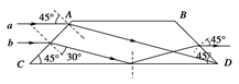 如图表示两面平行玻璃砖的截面图,一束平行于CD边的单色光入射到AC界面上,a、b是其中的两条平行光线.光线a在玻璃砖中的光路已给出.画出光线b的光路图并求出从玻璃砖中首次出射时的折射角![]()
