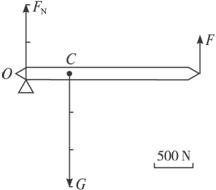 一段已采伐下的树干横卧在水平地面上,树干重1 500 N,现用500 N竖直向上的力作用在树干的一端,刚好能将树干抬起.试运用初中所学的杠杆原理求出树干的重心位置,并画出树干所受力的图示.