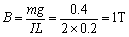 | 由题意可知ab中的电流大小为 欲使ab对轨道压力恰为零,则mg=BIL. 得