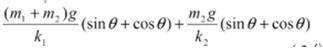 如图所示,倾角为θ的光滑斜面ABC放在水平面上,劲度系数分别为k1、k2的两个轻弹簧沿斜面悬挂着,两弹簧之间有一质量为m1的重物,最下端挂一质量为m2的重物,此时两重物处于平衡状态,现把斜面ABC绕A点缓慢地顺时针旋转90°后,重新达到平衡。试求:m1、m2沿斜面各移动的距离。![]()
