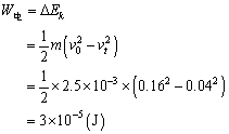 当t=4s时, x正向最大为 xm=0.32m。 当t=5s时, x=0.3m。 ∴ 路程s=0.32+(0.32-0.3)=0.34(m)。 ∵ v0=0.16m/s,a=-0.04(m/s2), ∴ t=5s, v1=v0+at=0.16-0.04´5=-0.04m/s。 动能定理
