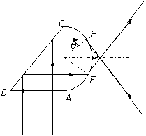 ABC=45°,ADC为一圆弧,其圆心在AC边的中点。此透明物体的折射率为n=2.0。若一束宽度与AB边长度相等的平行光从AB边垂直射入透明物体,试由光路图画出光线从ADC圆弧射出的区域,并求此区域的圆弧长度s。(不考虑经ADC圆弧反射后的光线)