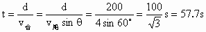 (2) 要使小船垂直过河,小船的合速度应垂直河岸,如图所示,则渡河时间 |