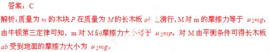 (2013福建省二校联考)如图3所示,质量为m的木块P在质量为M的长木板ab上滑行,长木板放在水平地面上一直处于静止状态.若长木板ab与地面间的动摩擦因数为μ1,木块P与长木板ab间的动摩擦因数为μ2,则长木板ab受到地面的摩擦力大小为 ( )