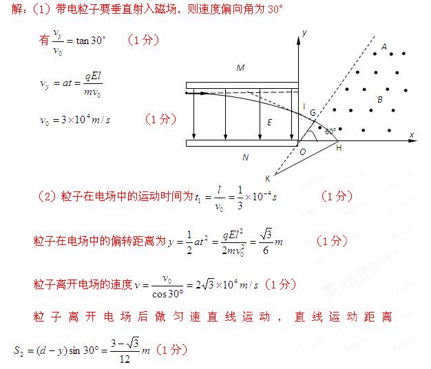 由此可知,带电粒子在磁场中的偏转角度为30°(1分)