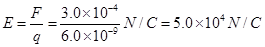 试题分析:由题,电量q=6.0×10-9C,电场力F=3.0×10-4N,则这一点处的电场强度的大小