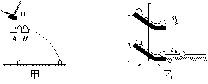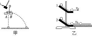 (6分)在探究物体作平抛运动规律的实验中,某同学作了下图甲、乙所示的实验.如图甲所示的实验中,A、B两球同时落地,说明 ,如图乙所示的实验中,将两个斜槽固定在同一竖直面内,最下端水平,滑道2与光滑水平板连接,把两个质量相等的小钢球从斜面的同一高度由静止同时释放,球1落到光滑水平板上并击中球2,这种现象说明 .