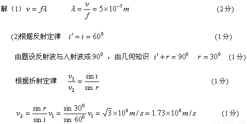 的入射角从甲介质射到乙介质的界面上,同时发生反射和折射,若反射线与折射线成90o角,波在甲介质中的波速为3.0×108m/s,求