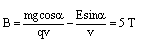(14分)如图所示,足够长的光滑绝缘斜面与水平面的夹角为α(sinα=0.6),放在匀强电场和匀强磁场中,电场强度E="50" V/m,方向水平向左,磁场方向垂直纸面向外.一个电荷量为q=4×10-2C,质量m="0.40" kg的光滑小球,以初速度v0="20" m/s从斜面底端向上滑,然后又下滑,共经过3 s脱离斜面,求磁场的磁感应强度.(g取10 m/s2)![]()
