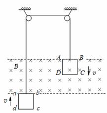 ½â£º (1) ÈçͼËùʾ£¬ÉèÁ½Ïß¿ò¸ÕÔÈËÙÔ˶¯µÄËÙ¶ÈΪv¡¢´ËʱÇáÉþÉϵÄÕÅÁ¦ÎªT£¬Ôò¶ÔABCDÓУº