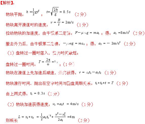 £¨2013ɽ¶«Ê¡µÂÖÝÊп¼Ç°ÑµÁ·Ìâ5£©ÈçͼËùʾ£¬Ë®Æ½·ÅÖõÄÔ²ÅÌÉÏ£¬ÔÚÆä±ßÔµ C µã¹Ì¶¨Ò»¸öСͰ£¬Í°µÄ¸ß¶È²»¼Æ£¬Ô²Å̰뾶Ϊ R = 1 m,ÔÚÔ²ÅÌÖ±¾¶ CD µÄÕýÉÏ·½£¬Óë CD ƽÐзÅÖÃÒ»Ìõˮƽ»¬µÀ AB £¬»¬µÀÓÒ¶Ë B ÓëÔ²ÅÌÔ²ÐÄ O ÔÚͬһÊúÖ±ÏßÉÏ£¬ÇÒ B µã¾àÀëÔ²ÅÌÔ²ÐĵÄÊúÖ±¸ß¶È h = 1£®25 m£¬ÔÚ»¬µÀ×ó¶Ë¾²Ö¹·ÅÖÃÖÊÁ¿Îª m = 0£®4 kgµÄÎï¿é£¨¿ÉÊÓΪÖʵ㣩£¬Îï¿éÓ뻬µÀµÄ¶¯Ä¦²ÁÒòÊýΪ ¦Ì = 0£®2£¬ÏÖÓÃÁ¦ F = 4 NµÄˮƽ×÷ÓÃÁ¦À¶¯Îï¿é£¬Í¬Ê±Ô²ÅÌ´ÓͼʾλÖã¬ÒÔ½ÇËÙ¶È ¦Ø = 2¦Ð rad/s£¬ÈÆÍ¨¹ýÔ²ÐÄ O µÄÊúÖ±ÖáÔÈËÙת¶¯£¬ÀÁ¦×÷ÓÃÔÚÎï¿éÒ»¶Îʱ¼äºó³·µô£¬×îÖÕÎï¿éÓÉB µãˮƽÅ׳ö£¬Ç¡ºÃÂäÈëÔ²Å̱ßÔµµÄСͰÄÚ£®ÖØÁ¦¼ÓËÙ¶ÈÈ¡10m/s2£®