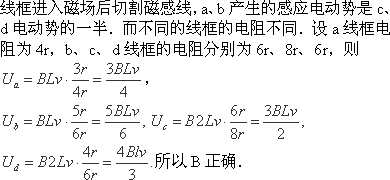 用相同导线绕制的边长为L或2L的四个闭合导体线框,以相同的速度匀速进入右侧匀强磁场,如图所示。在每个线框进入磁场的过程中,M、N两点间的电压分别为Ua、Ub、Uc和Ud。下列判断正确的是 ( )![]()