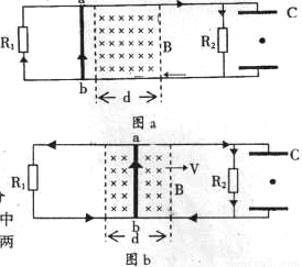设滑杆ab的速度为v,由右手定则可知电路中电流流向如图b所示,ab杆为电源,R1、R2,并联,