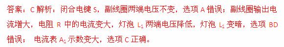 (2013唐山摸底)如图所示,理想变压器原线圈接一交流电源,副线圈回路中有一定值电阻R和两个小灯泡L1、L2,最初电键S是断开的,现闭合电键S,则