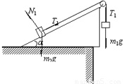 解:第一次,小物块受力情况如图所示,设T1为绳中张力,a1为两物块加速度的大小,l为斜面长,则有