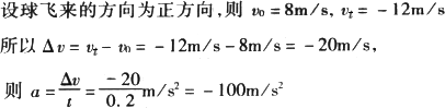 足球以8 m/s的速度飞来,运动员把它以12 m/s的速度反向踢出,踢球时间为0.2 s,设球飞来的方向为正方向,则足球在这段时间内的加速度是