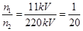 某发电厂输出的功率为200kW,输出电压为11kV。若采用220kV的高压输电,那么,升压变压器(不计变压器能量损失)的原线圈和副线圈的匝数比为____;输电电流为______A。