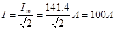 有一正弦交流电,它的电流瞬时值的表达式为i="141.4sin314t" A。那么它的电流有效值是
