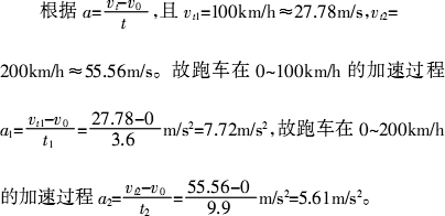 330 km/h,0~100 km/h的加速时间只需要3.6 s,0~200 km/h的加速时间仅需9.9 s,则该跑车在0~100 km/h的加速过程中和0~200 km/h的加速过程的平均加速度分别为________m/s2和________m/s2.|