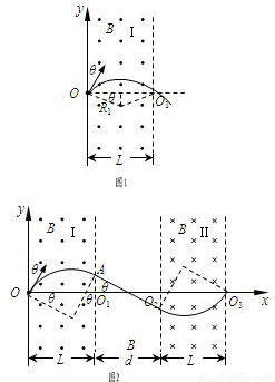 扭摆器是同步辐射装置中的插入件,能使粒子的运动轨迹发生扭摆,其简化模型如图所示:Ⅰ、Ⅱ两处宽度均为L的条形匀强磁场区边界竖直,Ⅰ区域磁场垂直纸面向外,Ⅱ区域磁场垂直纸面向里,磁感应强度大小均为B,两磁场区的间距可以调节.以Ⅰ区域左边界上的O点为坐标原点建立坐标系,y轴与左边界重合,x轴与磁场边界的交点分别为O1、O2和O3.一质量为m、电荷量为q的带正电的粒子,平行纸面从O点与y轴的夹角θ=30°射入Ⅰ区域,粒子重力不计.(1)若粒子恰好从O1射出Ⅰ区域,粒子的速度应为多大?